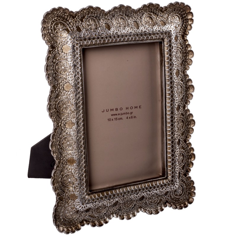 Декоративна рамка за снимка със стойка, изработена от полирезин в сребрист цвят с релефни флорални орнаменти и стъкло.