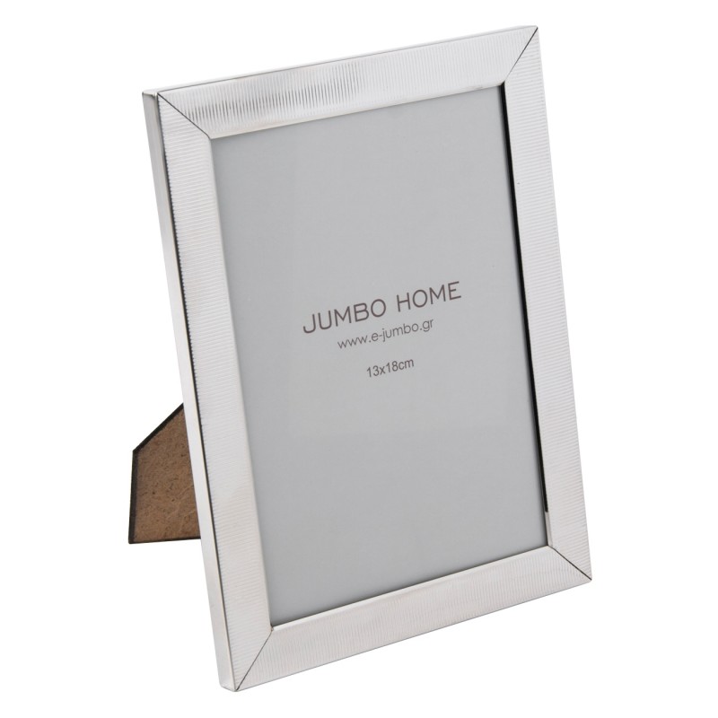 Класическа рамка за снимка, изработена от метал в сребрист цвят с релефна райе и стъкло.