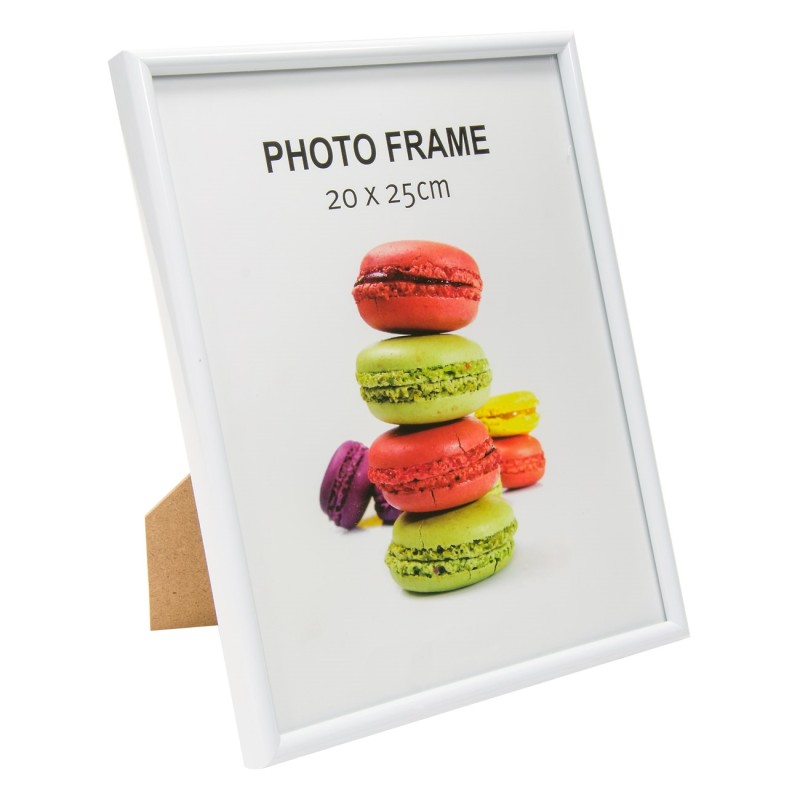 Класическа рамка за снимка със стойка, изработена от качествена и олекотена пластмаса в бял цвят и прозрачен плексиглас.