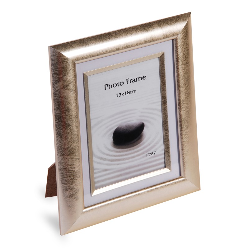 Класическа рамка за снимка със стойка, изработена от качествена пластмаса в сребрист цвят и стъкло.