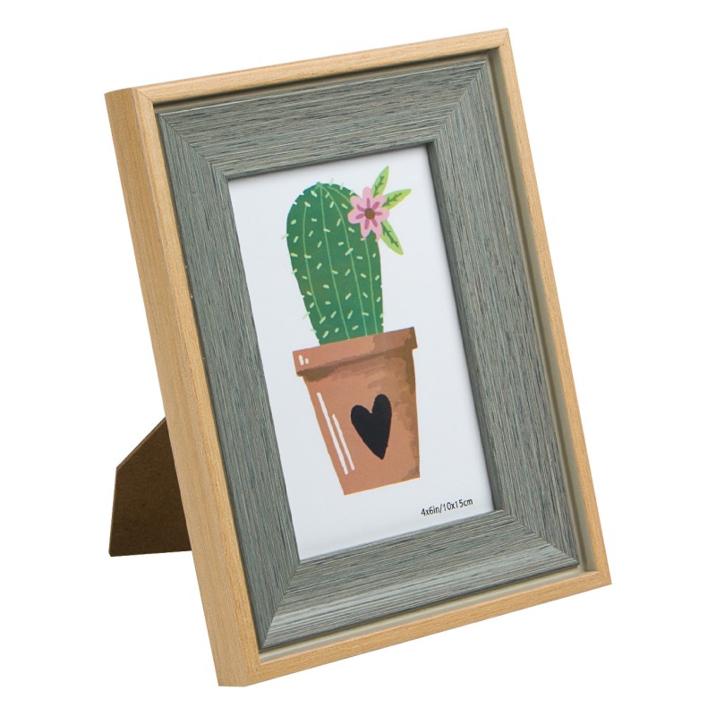 Двойна рамка за снимка със стойка, изработена от качествена дървесина в сиво и бежово и стъкло.
