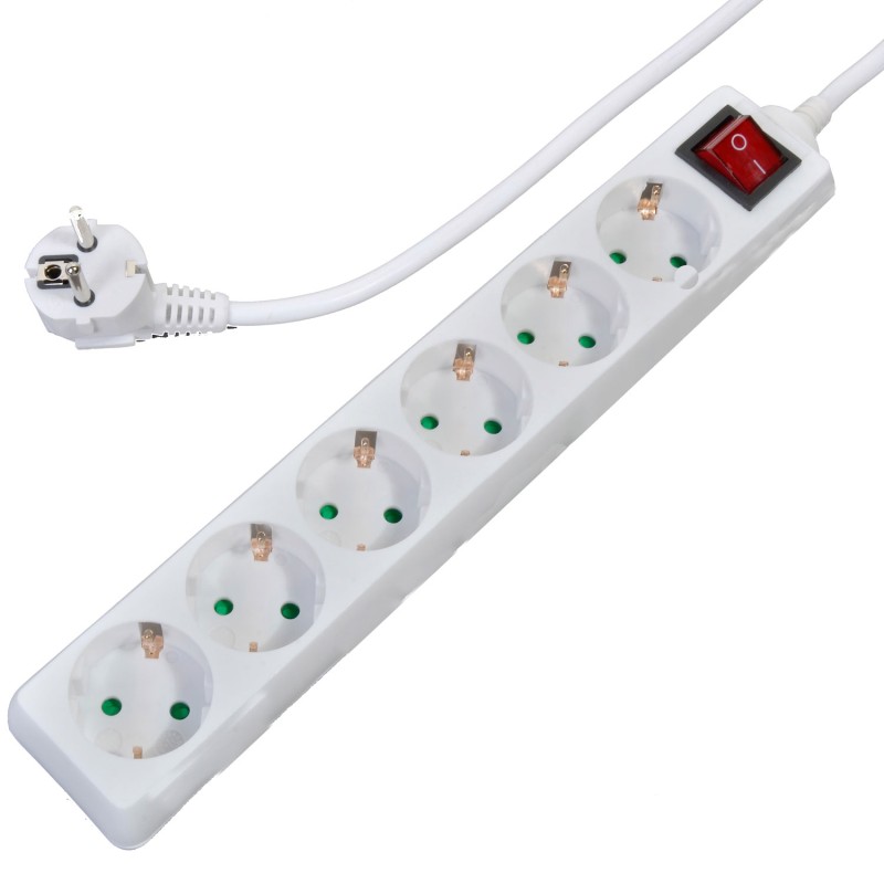 Разклонител с 6 гнезда, ключ за включване / изключване и кабел с дължина 1.5 метра.