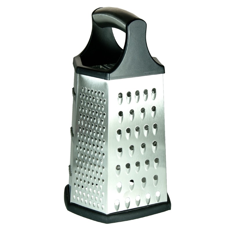 Кухненско ренде за настъргване, изработено от неръждаема стомана с удобна пластмасова дръжка в черен цвят.