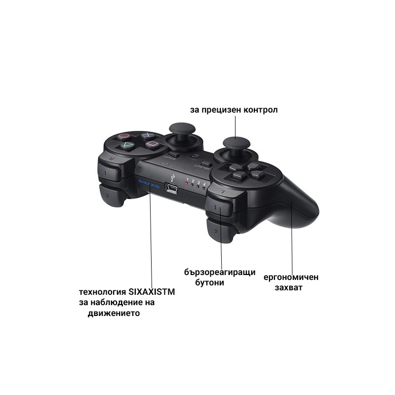 DUALSHOCK®3 използва технологията Bluetooth за безжично възпроизвеждане на игри и USB кабелът на контролера за безпроблемно и автоматично зареждане на контролера чрез PlayStation®3 по всяко време.