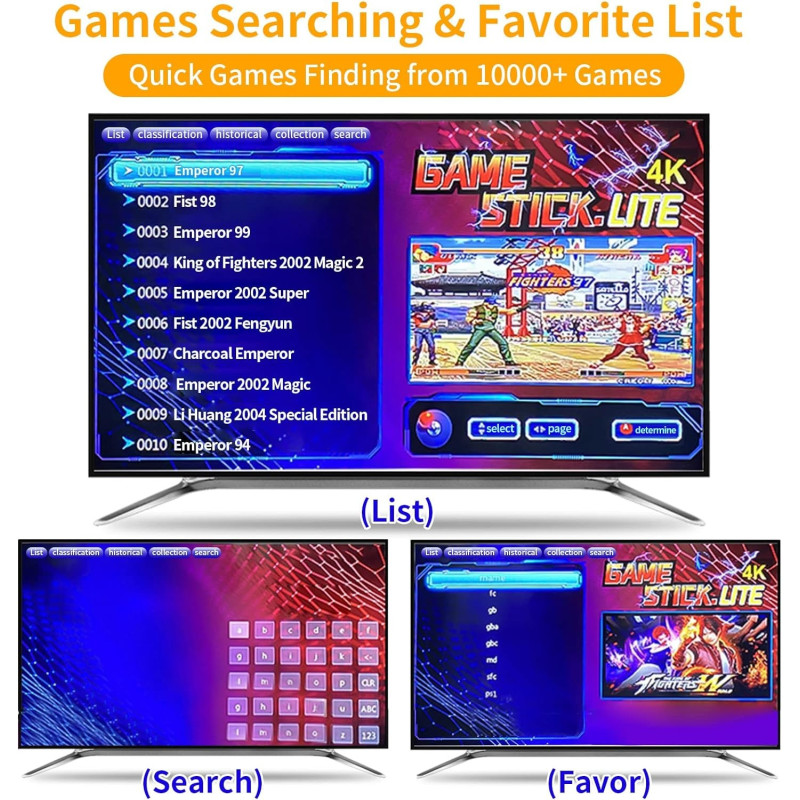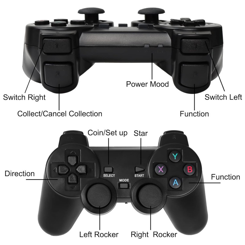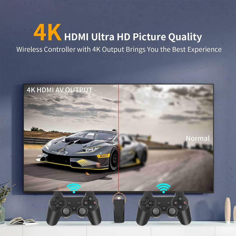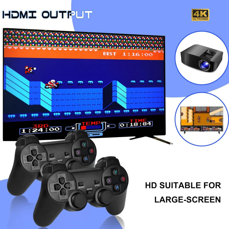 Безжична игрална конзола с карта памет, вградени повече от 35000 игри. Използвайте надградени чипове за игри, за да поддържате 8-битови, 16-битови, 32-битови, 64-битови, 128-битови и други емулатори. Той напълно отговаря на вашите нужди за качество на изображението и плавност на играта. 4K HDMI изход Свържете се към телевизора или дисплея на компютъра чрез HDMI и играйте хиляди игри незабавно. Нека можете лесно да се наслаждавате на ярки и вълнуващи видео игри на голям екран. Оборудван с 2 безжични дръжки, plug and play, удобно усещане за ръка, можете по -добре да споделите забавлението си със семейството или приятелите си. Wireless 2.4GHz безжичен