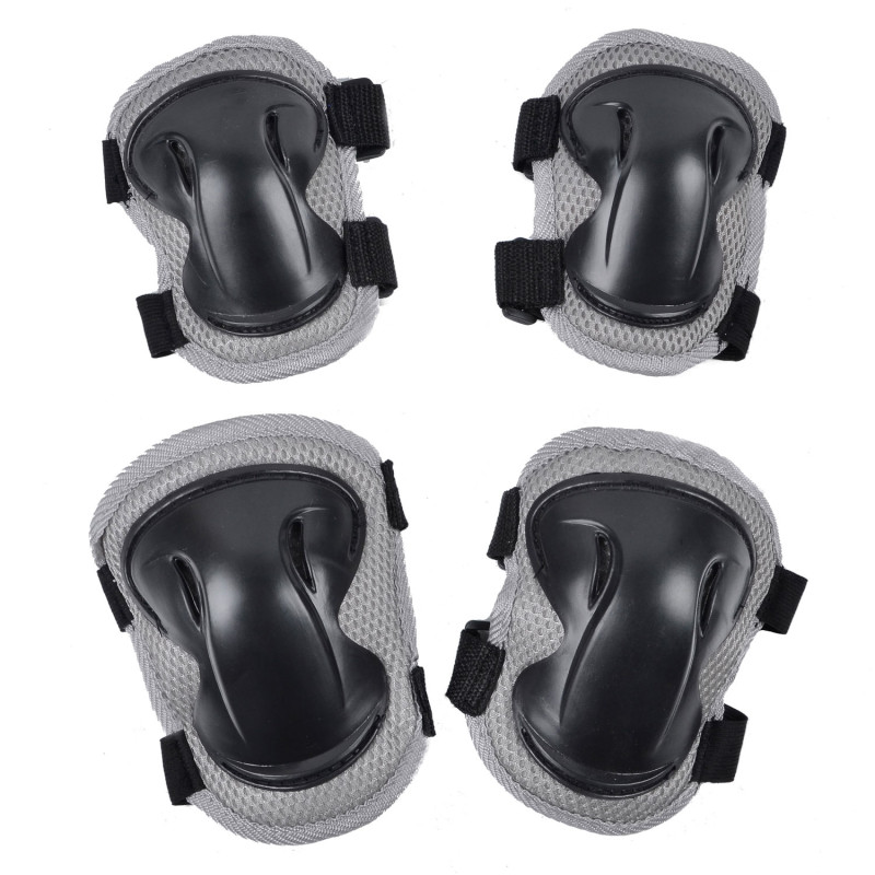 Комплект от 4 броя протектори за скейтборд (2 бр. наколенки, 2 бр. налакътници), изработени от здрави и устойчиви материали в черно и сиво.