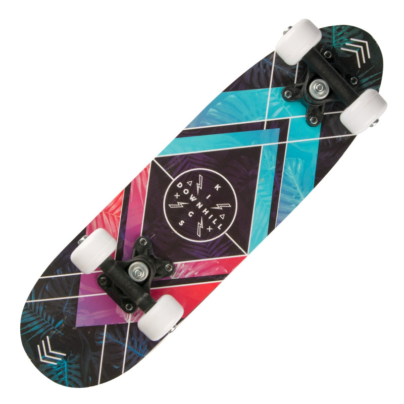 Детски скейтборд в черен цвят, изработен от високоустойчива, здрава и плътна дървесина с разноцветни ромбоидни шарки.