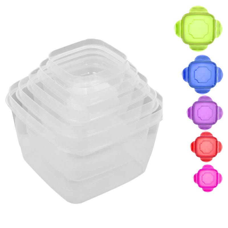 5 броя прозрачни пластмасови кутии за съхранение на храна с разноцветни капаци с клик-клак система, осигуряваща плътно, херметизиращо затваряне.