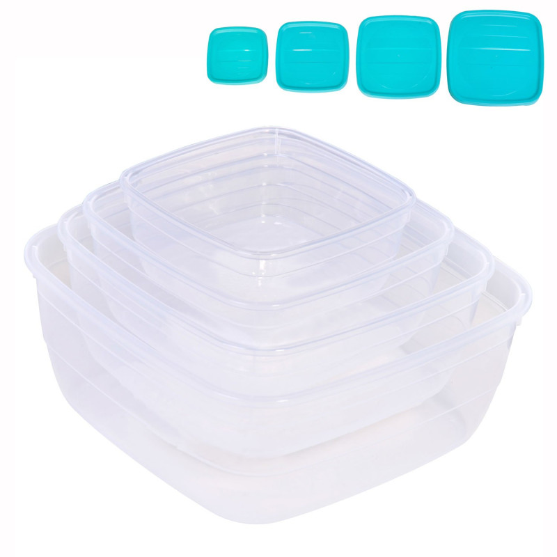 4 броя прозрачни пластмасови кутии за съхранение на храна с капак, осигуряващ плътно затваряне без опасност от разливане.