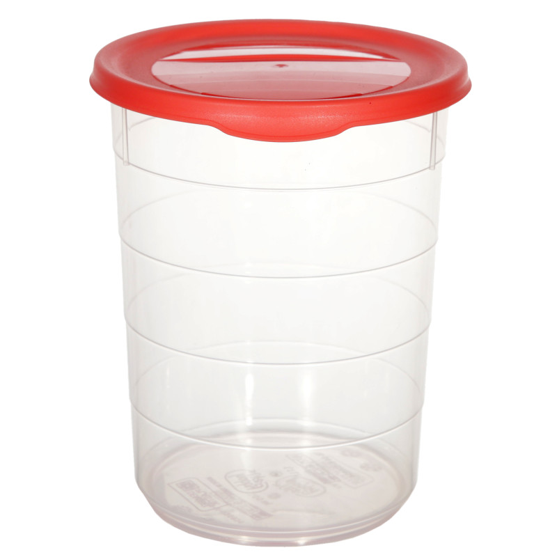 Прозрачен пластмасов съд за съхранение на храна с капак, гарантиращ плътно, херметизиращо затваряне.