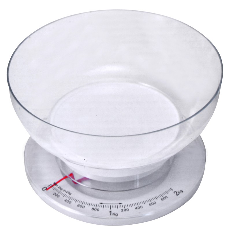 Механичен кухненски кантар, изработен от висококачествена пластмаса в бял цвят с капацитет 2 кг. Разполага с практична купа за лесна употреба.