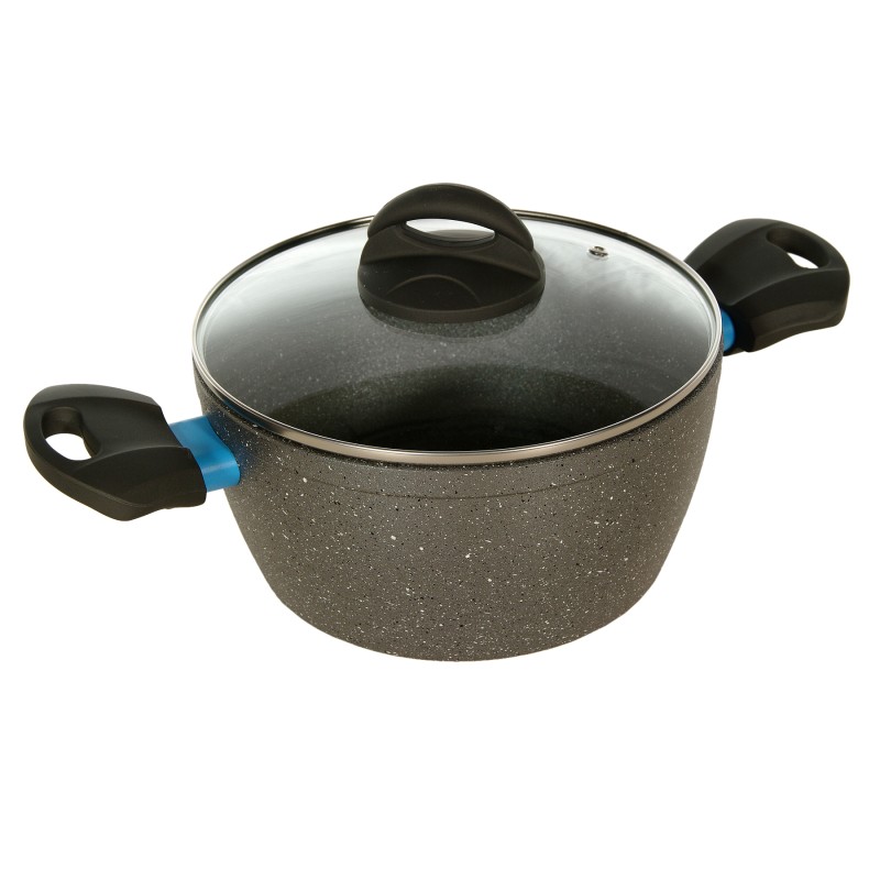 Кухненска тенджера за готвене с практичен стъклен капак и бакелитни топлоизолиращи дръжки, изработена от висококачествен алуминий с дебелина 4 мм. и незалепващо подсилено покритие с каменни частици и красив мраморен ефект.