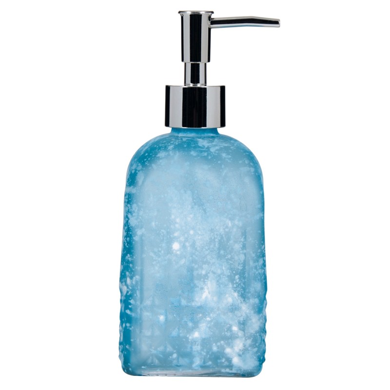 Дозатор за течен сапун, изработен от висококачествено стъкло в тюркоазено син цвят с "напръскан" ефект и метална капачка.