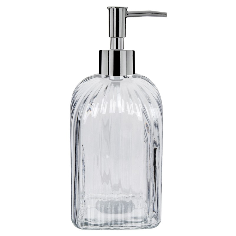 Прозрачен дозатор за течен сапун, изработен от висококачествено стъкло в сив цвят със сребристи елементи.
