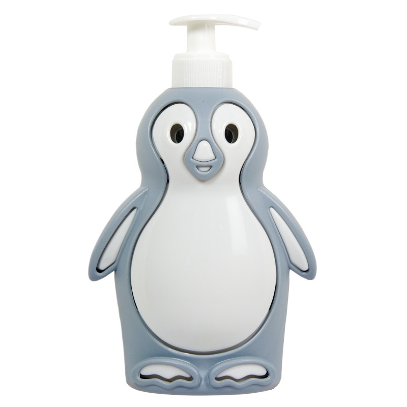 Дозатор за течен сапун, изработен от висококачествена пластмаса в сиво и бяло във формата на симпатичен пингвин.