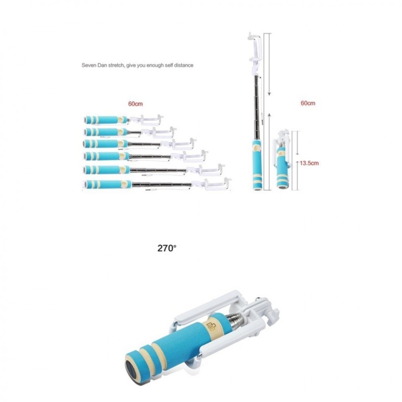 Представяме на вашето внимание супер луксозния селфи стик с телескопично разпъване за самозаснемане с кабел подходящ за всички модели телефони. Благодарение на този ултрa лек, мега компактен селфи стик (selfie stick) тип монопод, правенето на селфи снимки и видея никога не е било по - лесно и забавно. Дължината на монопод селфи стик-а може да се регулира, като максималната дължина е 80 см, а в сгънато положение е само 18 см (приблизително колкото iPhone 6 ). Универсалната поставка на selfie stick-а е подходяща за всякакви телефони, изработена е изцяло от пластмаса и е покрита с висококачествен силикон, които предпазва от изплъзване, надраскване и всякакви други повреди. Формата на поставката на селфи стика-а е така изработена, че телефона си има легло в което да влезне, а в същото време бутоните отстрани да не се натискат. Висококачествения силикон и формата на поставката позволяват да поставите вашия смартфон на selfie stick-а заедно с неговия калъф. Този монопод селфи стик има вграден бутон за снимане поставен на удобно място на ръкохватката му.