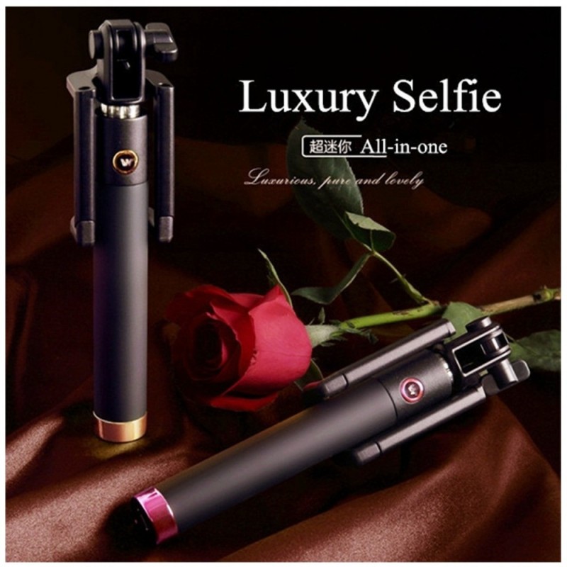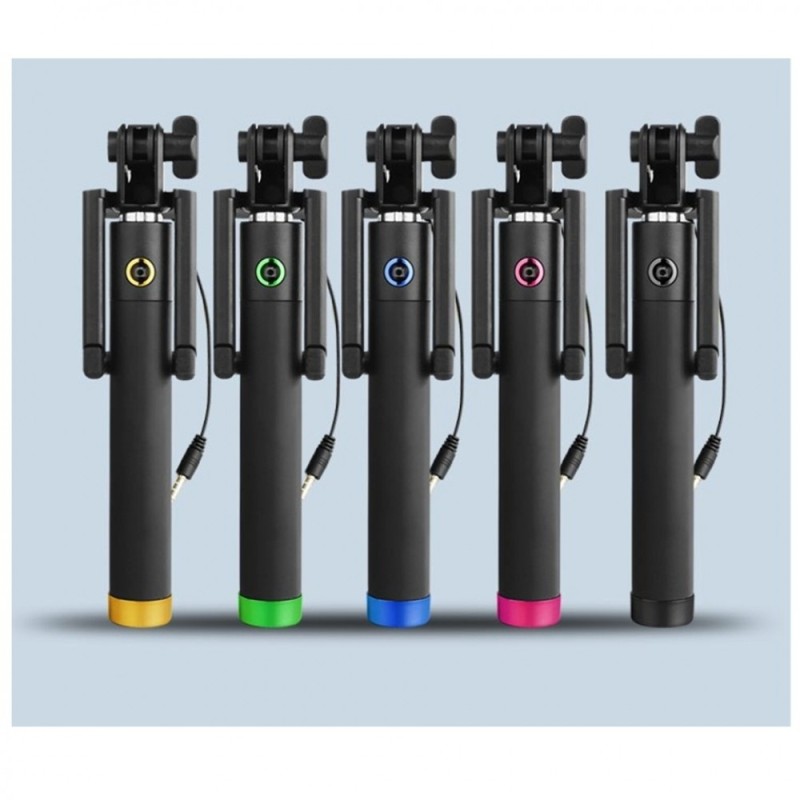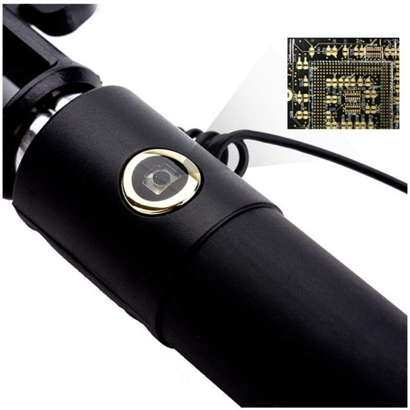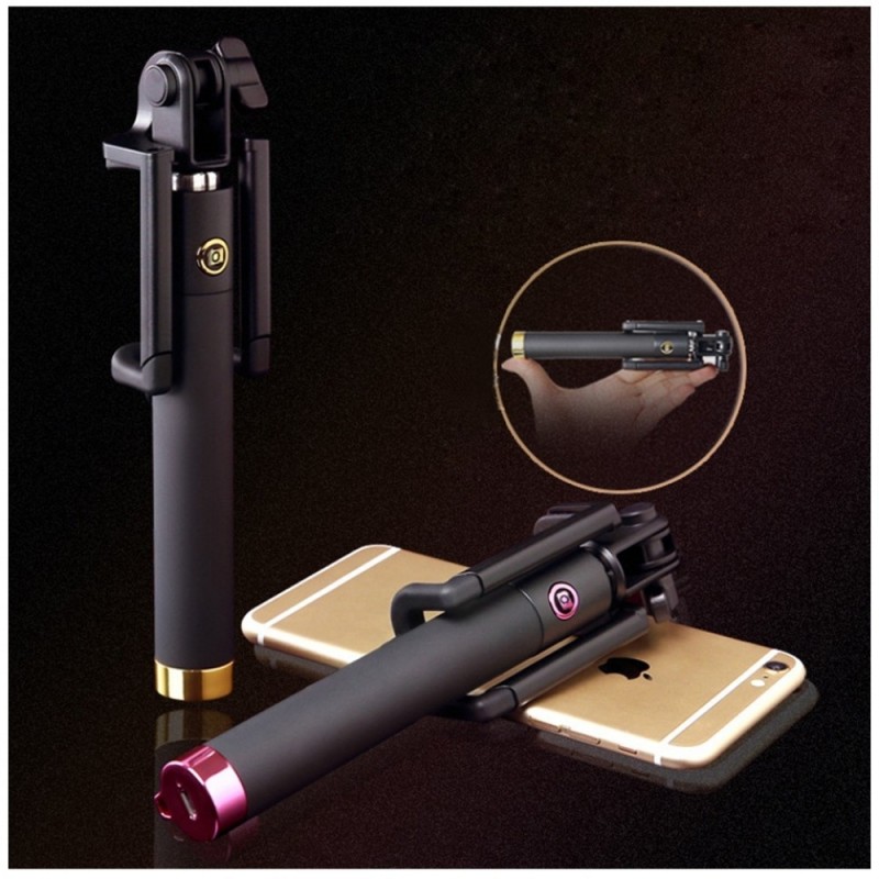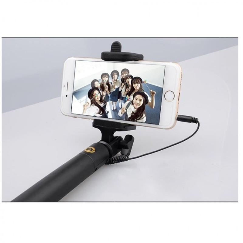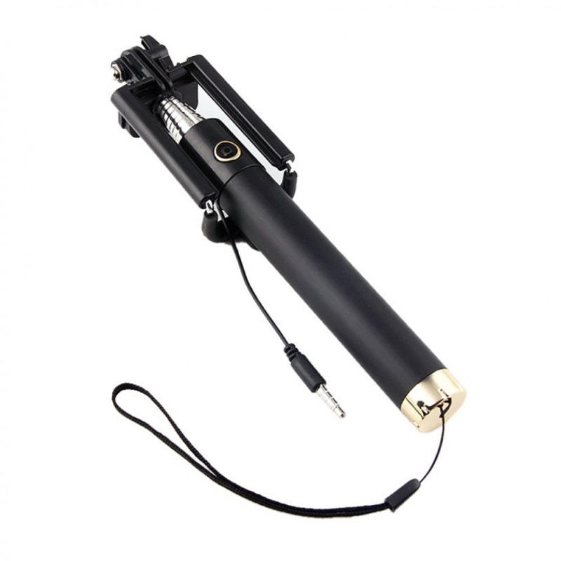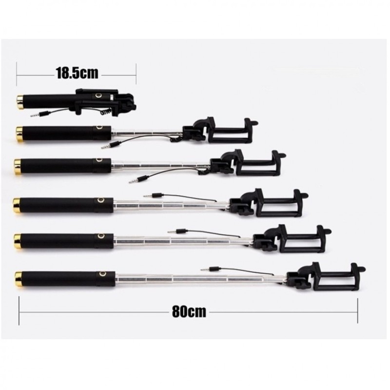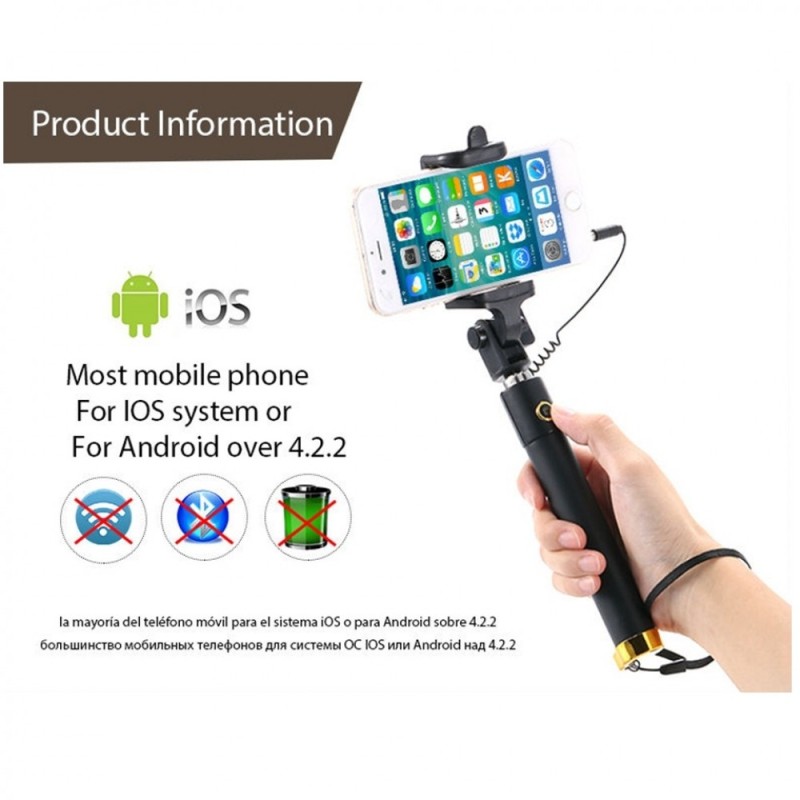 Представяме на вашето внимание супер луксозния селфи стик с телескопично разпъване за самозаснемане с кабел подходящ за всички модели телефони. Благодарение на този ултрa лек, мега компактен селфи стик (selfie stick) тип монопод, правенето на селфи снимки и видея никога не е било по - лесно и забавно. Дължината на монопод селфи стик-а може да се регулира, като максималната дължина е 80 см, а в сгънато положение е само 18 см (приблизително колкото iPhone 6 ). Универсалната поставка на selfie stick-а е подходяща за всякакви телефони, изработена е изцяло от пластмаса и е покрита с висококачествен силикон, които предпазва от изплъзване, надраскване и всякакви други повреди. Формата на поставката на селфи стика-а е така изработена, че телефона си има легло в което да влезне, а в същото време бутоните отстрани да не се натискат. Висококачествения силикон и формата на поставката позволяват да поставите вашия смартфон на selfie stick-а заедно с неговия калъф. Този монопод селфи стик има вграден бутон за снимане поставен на удобно място на ръкохватката му.