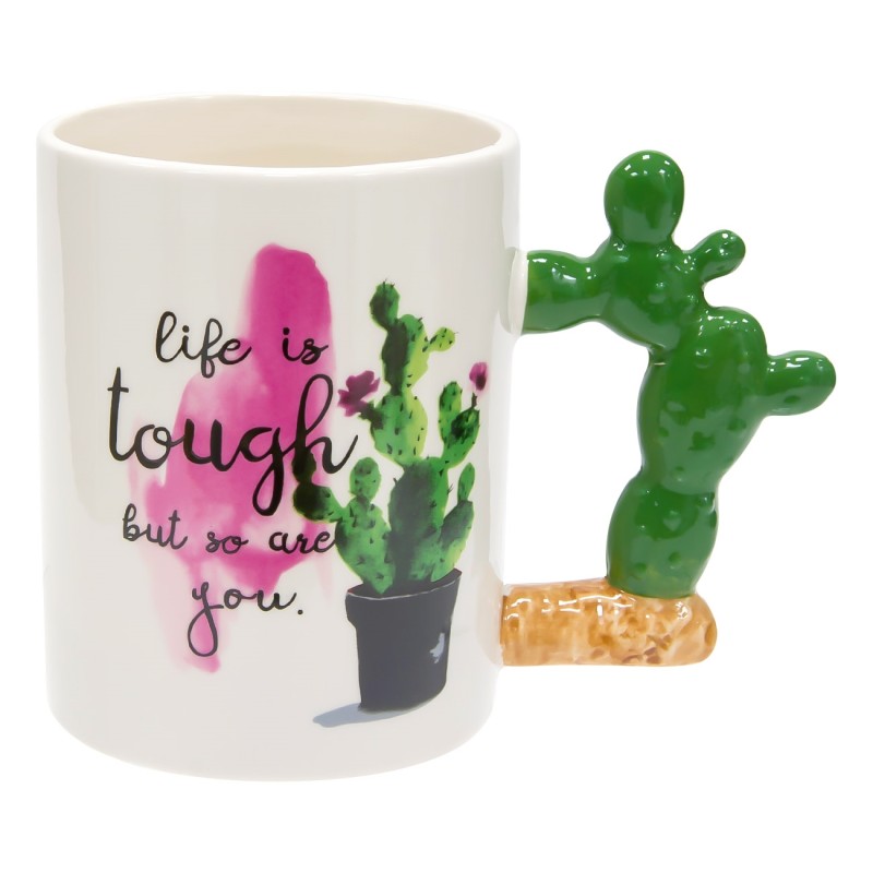 Чаша за топли напитки, изработена от висококачествена керамика в бял цвят с щампа на кактус и ефектна дръжка във формата на кактус.