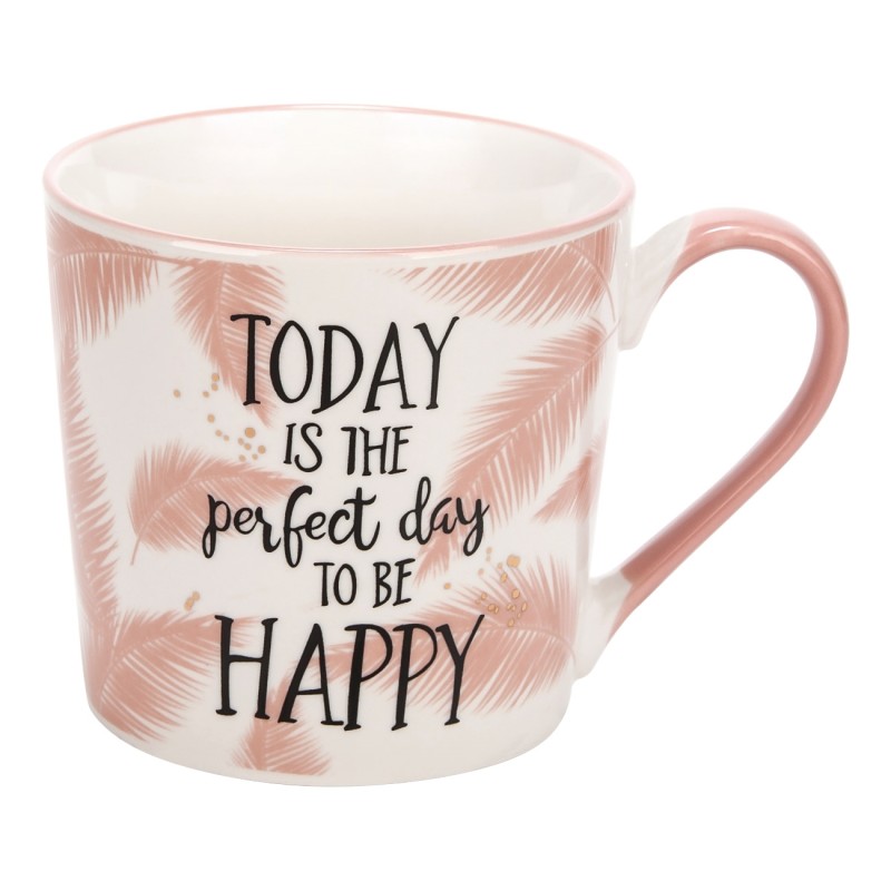 Чаша за топли напитки, изработена от висококачествена керамика в бял цвят с принт на розови пера и надпис.