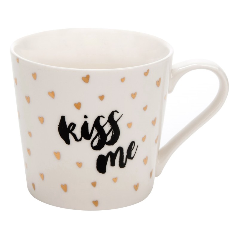 Чаша за топли напитки, изработена от висококачествена керамика в бял цвят с принт на златисти сърца и надпис Kiss me.