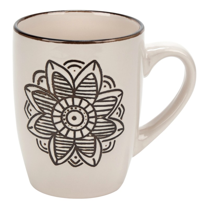 Чаша за топли напитки, изработена от висококачествена керамика в цвят екрю със стилизирана щампа на цвете.