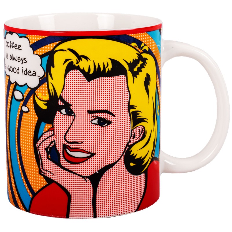 Чаша за топли напитки, изработена от висококачествен порцелан в бял цвят с щампа на жена в комикс стил и практична дръжка.