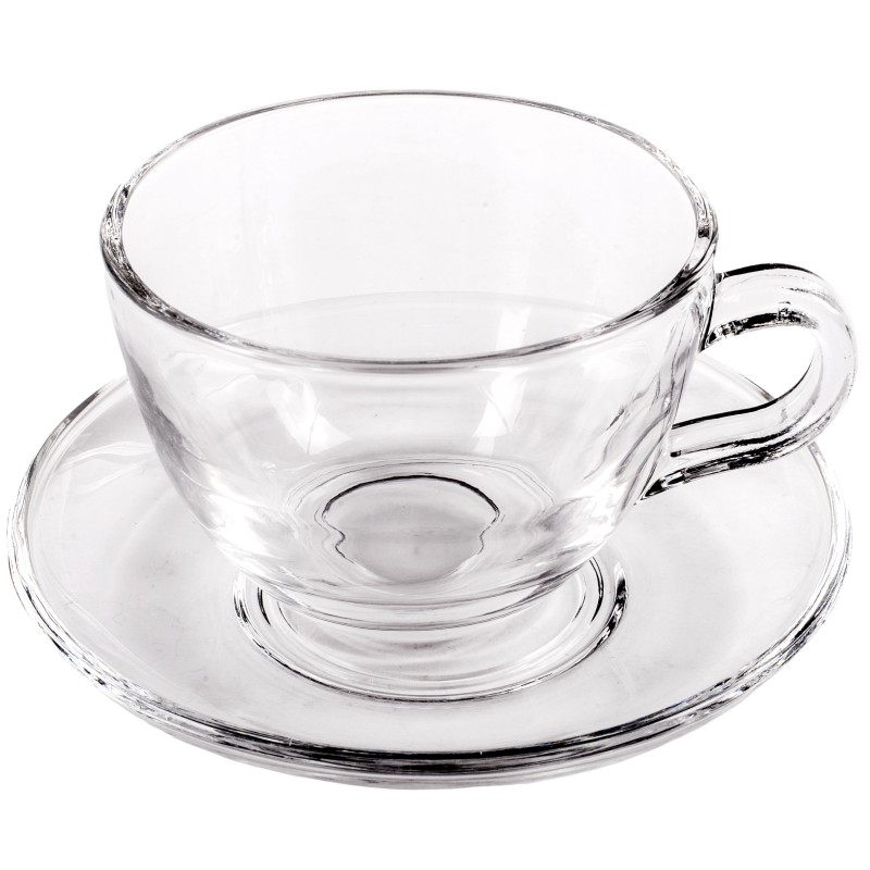 Чаша за топли напитки с чинийка, изработена от висококачествено прозрачно стъкло с удобна дръжка.