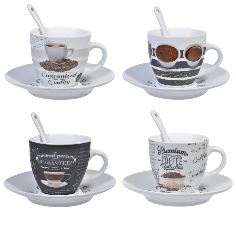 Сервиз за кафе от 12 части - 4 чаши, 4 чинийки и 4 лъжички, изработени от висококачествен порцелан в бял цвят с различни тематични щампи на чаша кафе и надписи.
