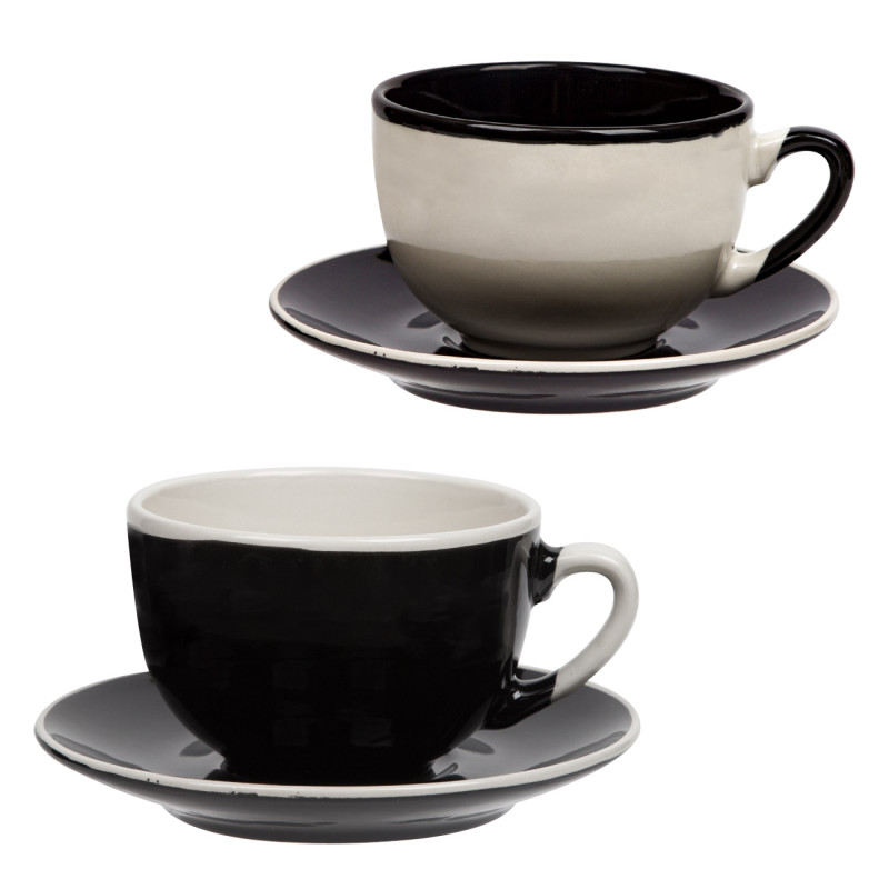 Коплект от 2 броя чаши за топли напитки с чинийки, изработени от висококачествена керамика в черно и бежово с удобна дръжка.