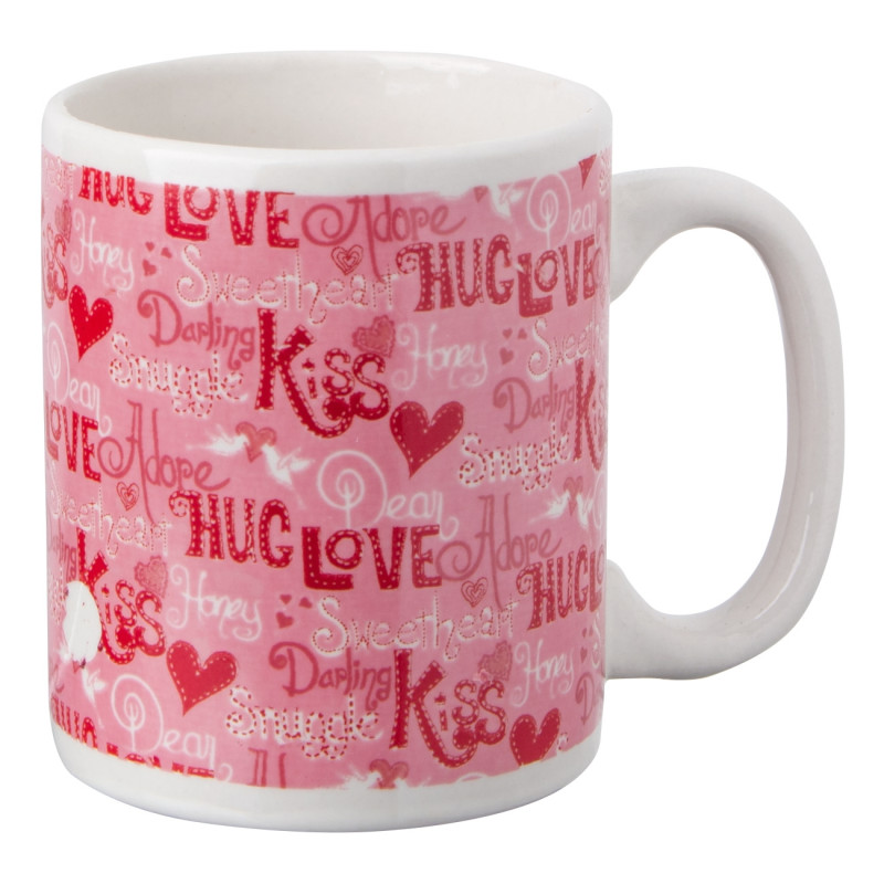 Чаша за топли напитки, изработена от висококачествена керамика в розов цвят с червени надписи и удобна дръжка.