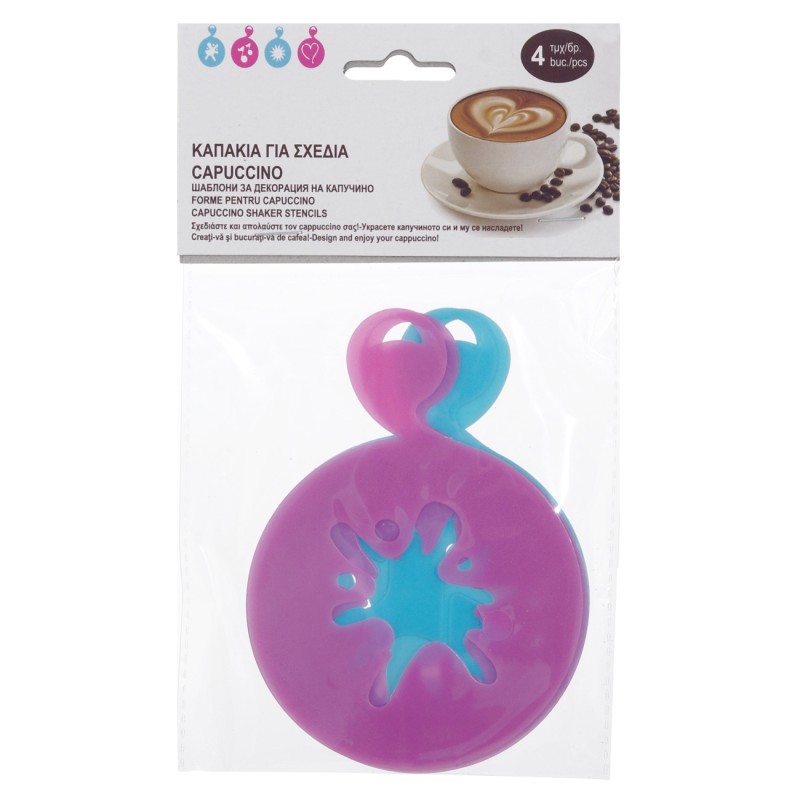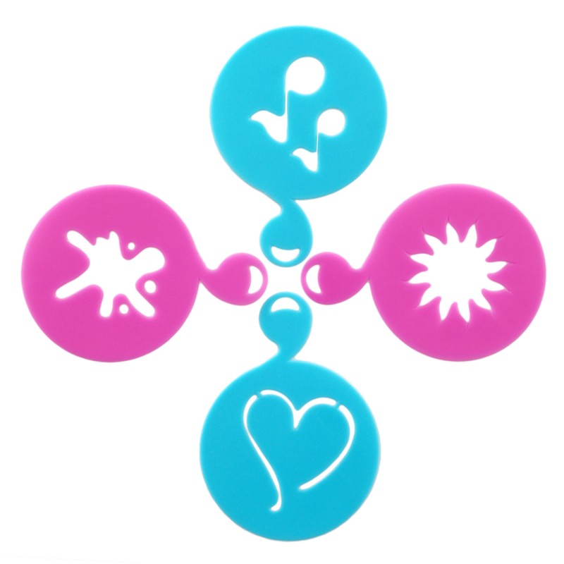 Комплект от 4 броя пластмасови шаблони в синьо и лилаво за декорация на капучино или други топли напитки с различни мотиви - сърце, ноти, слънце и капки.
