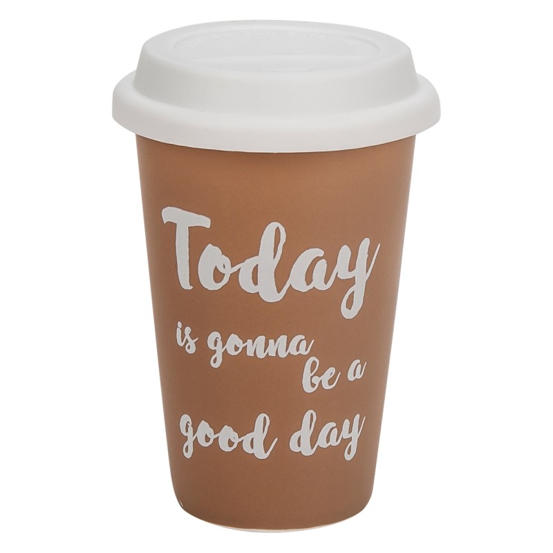Чаша за топли напитки, изработена от термоустойчива керамика в бежов цвят с позитивен надпис в бяло и бял силиконов капак, който запазва топлината на вашата напитка.