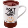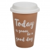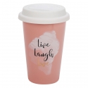 Чаша за топли напитки, изработена от термоустойчива керамика в розов цвят с надпис в черно и златисто Live Laugh Love и силиконов капак в бяло, който запазва топлината на вашата напитка максимално дълго.