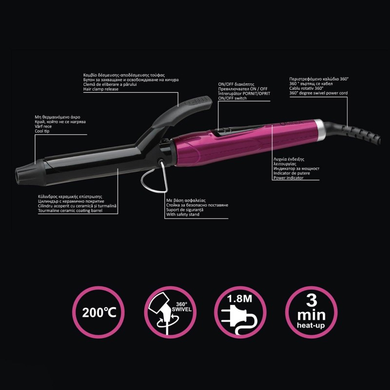 Отличава се с удобен и компактен размер, бутон за захващане и освобождаване на кичура, превключвател ON/OFF, връх, който не се нагрява, светлинен индикатор за мощност, цилиндър с керамично покритие, стойка за безопасно поставяне и 360° въртящ се кабел.