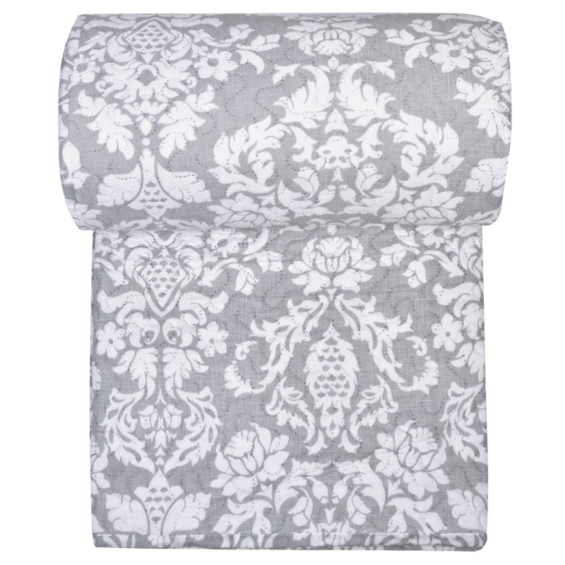 Шалте за спалня, изработено от мека и приятна материя в сив цвят с декоративни флорални орнаменти в бяло.