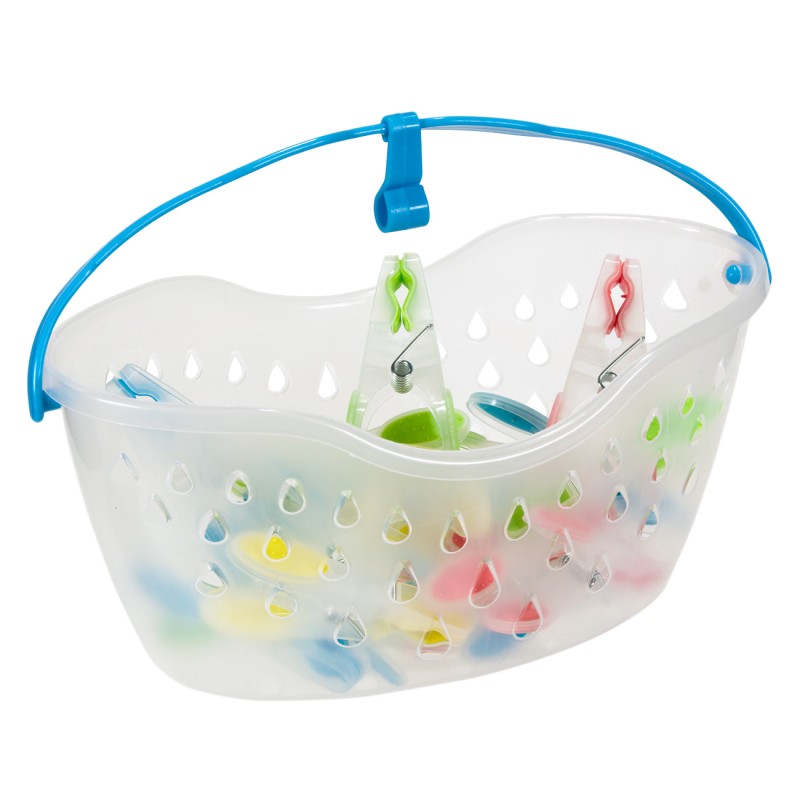 Комплект от 20 броя разноцветни щипки за пране + кошница, изработена от качествена пластмаса в бял цвят с практична дръжка със закачалка.