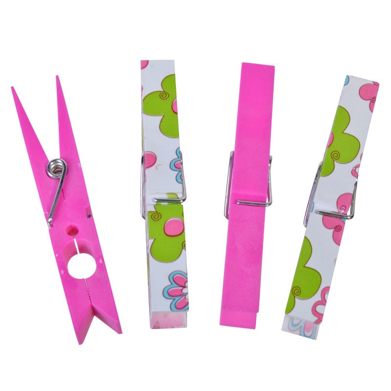 12 броя домакински щипки за пране с щампа на цветя, изработени от качествена пластмаса, устойчива на атмосферни влияния.