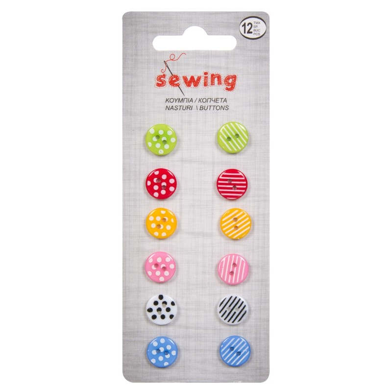 Комплект от 12 броя пластмасови копчета за дрехи в различни цветове - зелен, червен, жълт, розов, бял и син.