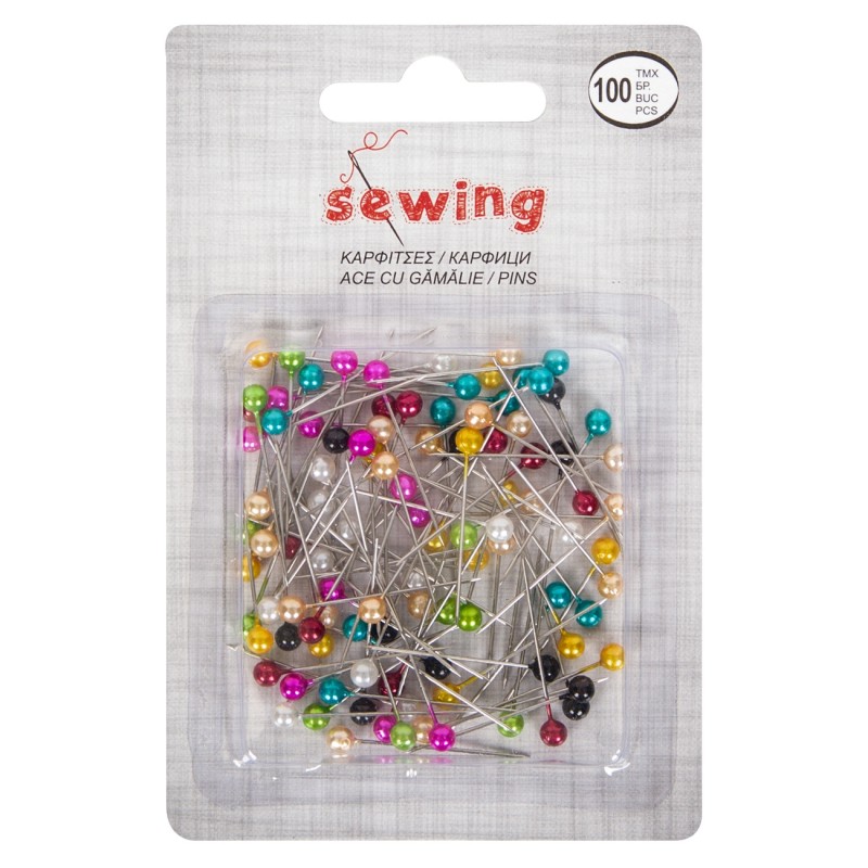 Икономична опаковка от 100 броя метални карфици с разноцветни перлени глави.