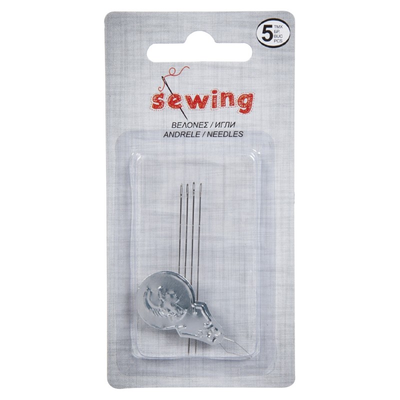 Комплект от 4 броя метални игли за шиене с различни размери + вдевачка за конец.