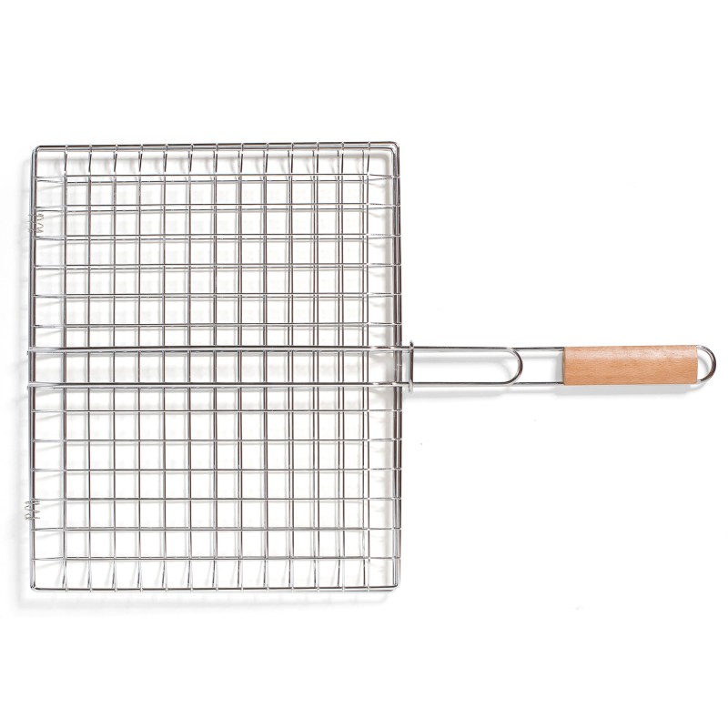 Правоъгълна скара за барбекю или открит огън, изработена от неръждаема стомана с плътен плет, идеална за малки парченца месо или зеленчуци без опасност от изпадане и ергономична дървена дръжка.