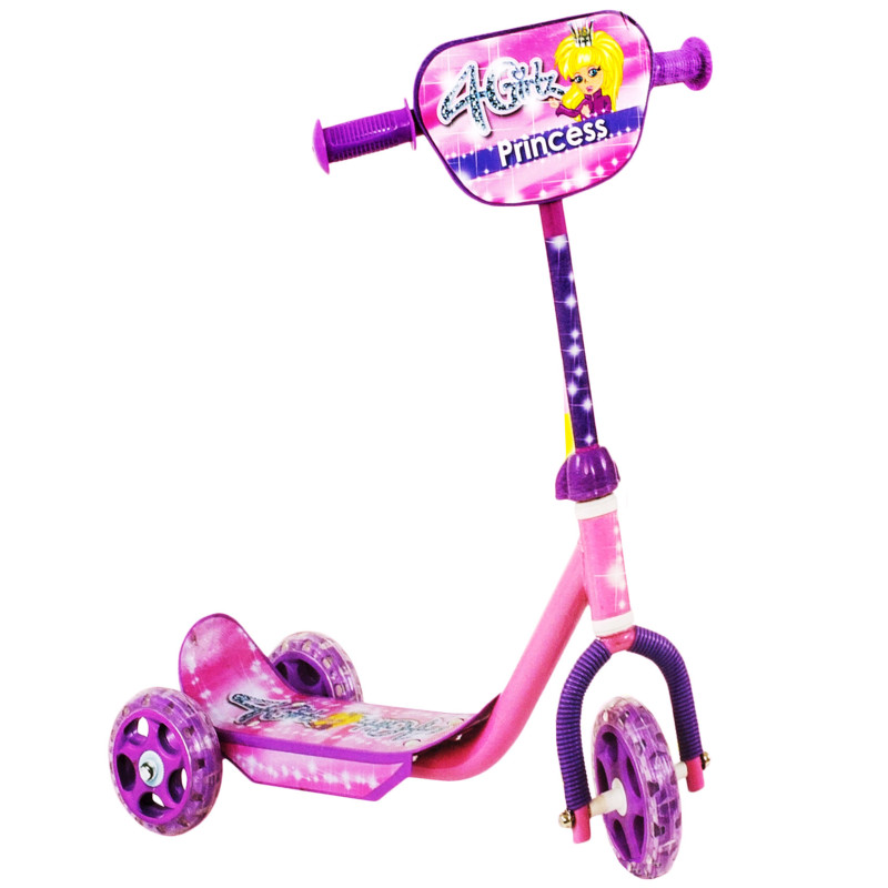 Детски скутер триколка в цикламени нюанси с картинка на принцеса, усилено монолитно кормило за 360° въртене, метална конструкция и три колела, които правят возенето меко и приятно.