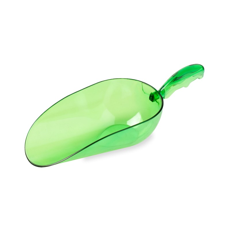 Голяма пластмасова полупрозрачна лопатка в зелен цвят за загребване с къса ергономична дръжка за по-добър захват.