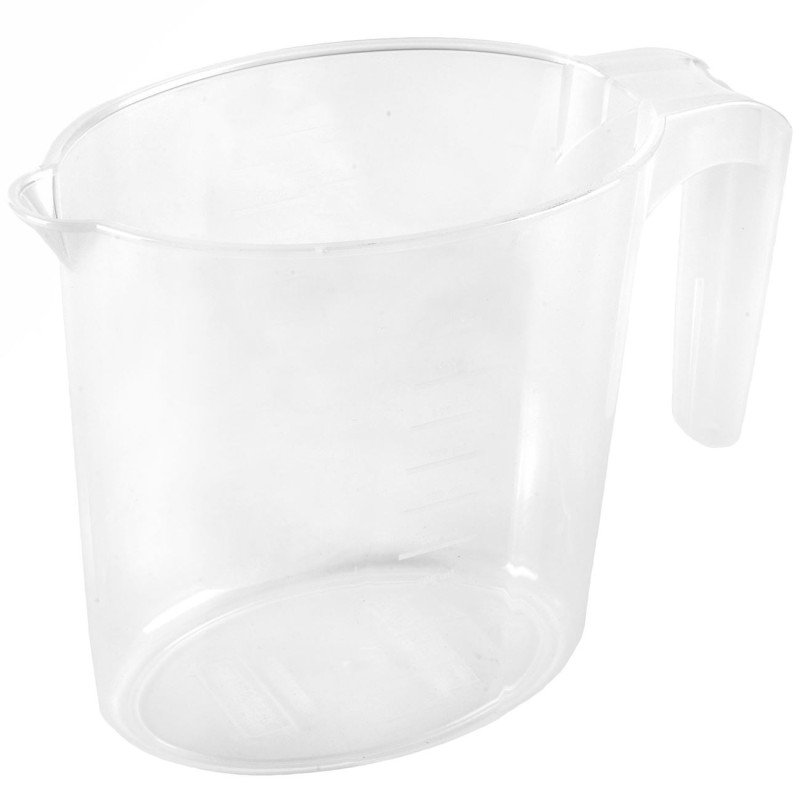 Полупрозрачна пластмасова мерителна кана в бял цвят с удобна дръжка, чучур и скала с фабрични количествени означения за течности в милилитри.