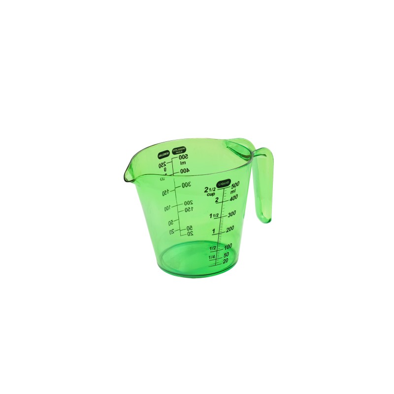 Пластмасова мерителна кана - мензура в зелен цвят с удобна дръжка и с фабрични количествени означения за грис и захар в грамове и за течности в милилитри.