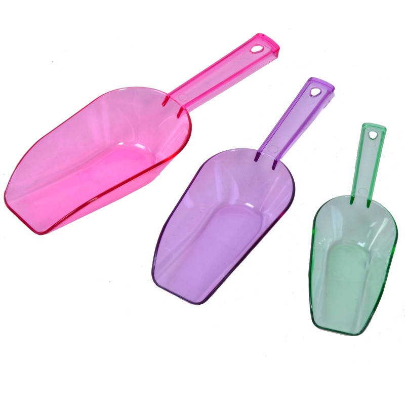 Комплект от 3 броя пластмасови прозрачни лопатки с различни размери зелено, лилаво и розово за загребване с удобна ергономична дръжка за по-добър захват.