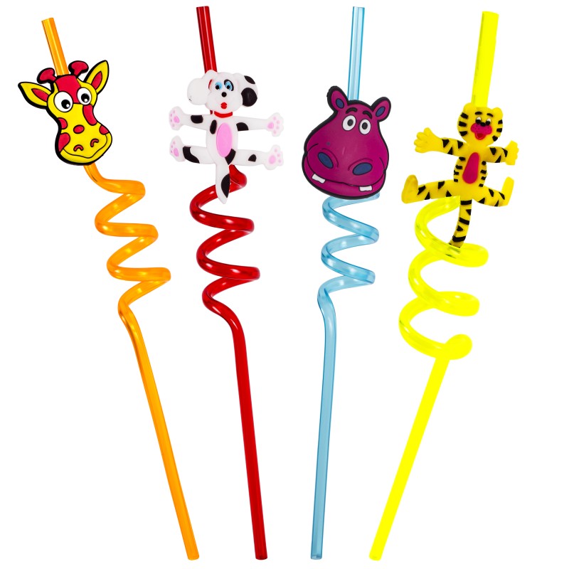 Комплект от 4 броя коктейлни сламки със спираловидно навита зона, изработени от плътна пластмаса в различни цветове със забавни декоративни фигурки на животни - жираф, куче, хипопотам и тигър.