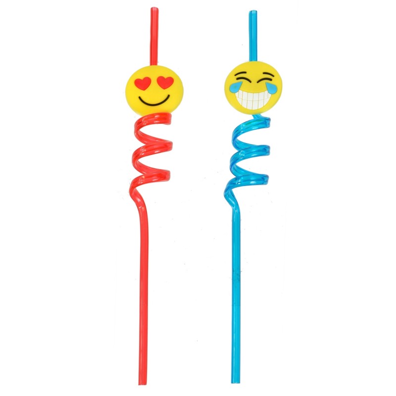 Комплект от 2 броя коктейлни сламки със спираловидно навита зона, изработени от плътна пластмаса в синьо и червено със забавни декоративни емотикони.
