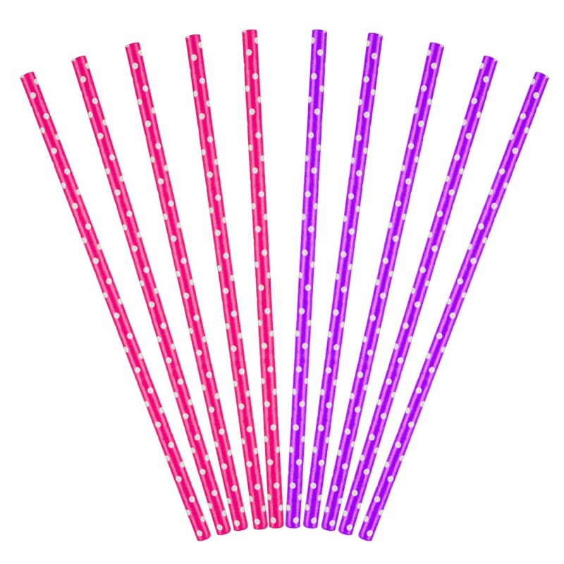 8 броя коктейлни сламки, изработени от хартия в бял цвят с цикламени точки.