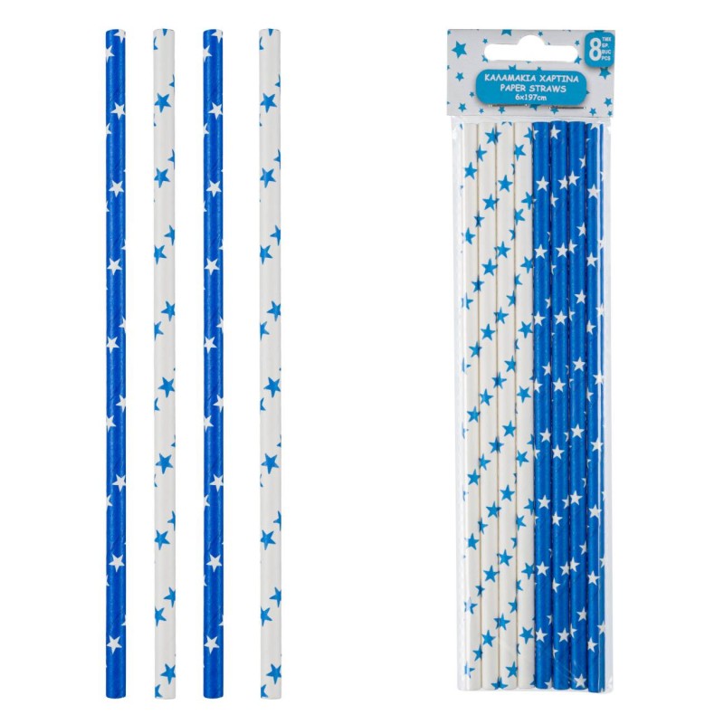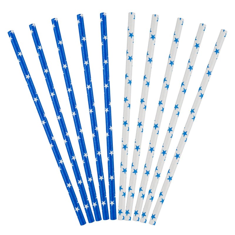 8 броя прави сламки, изработени от хартия в бял цвят с принт на сини звезди.